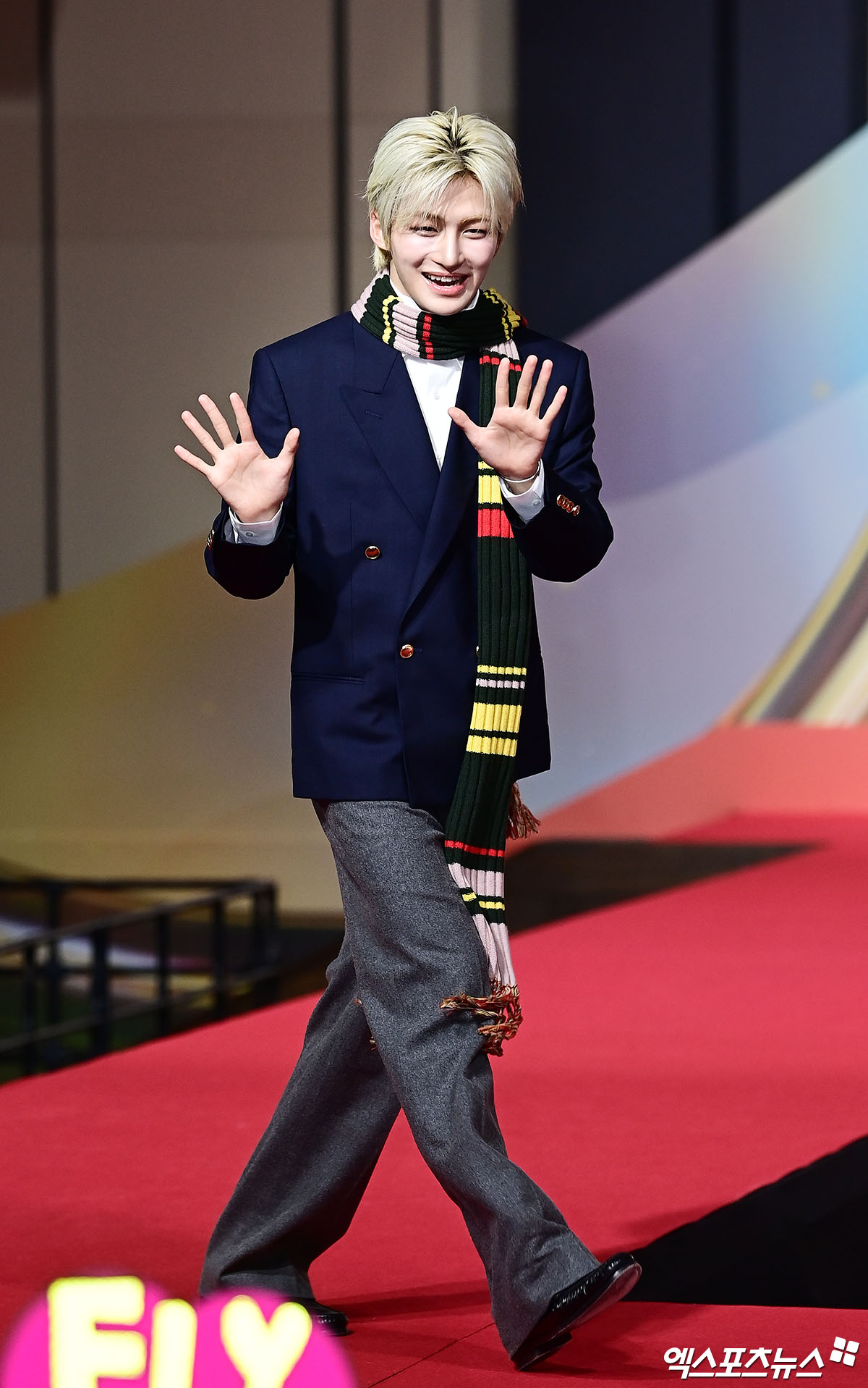 이날 레드카펫 행사에 참석한 투어스 지훈이 포토타임을 갖고 있다.