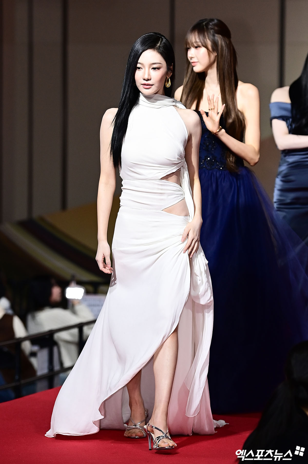 이날 레드카펫 행사에 참석한 닝닝은 드레이프 디자인이 돋보이는 홀터넥 맥시 드레스를 선택해 시선을 사로잡았다. 허리와 옆구리 라인을 과감하게 노출한 컷아웃 디테일로 관능적이면서도 트렌디한 매력을 극대화했다.