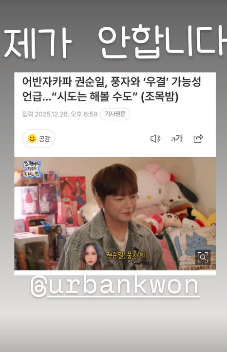 앞서 권순일은 유튜브 채널 '조현아의 평범한 목요일 밤'에 출연했고, 권순일은 이 게임에서 풍자에게 전화를 걸었다. “뭐 하냐”는 질문에 풍자는 “이제 스케줄이 끝났다”고 답했다.