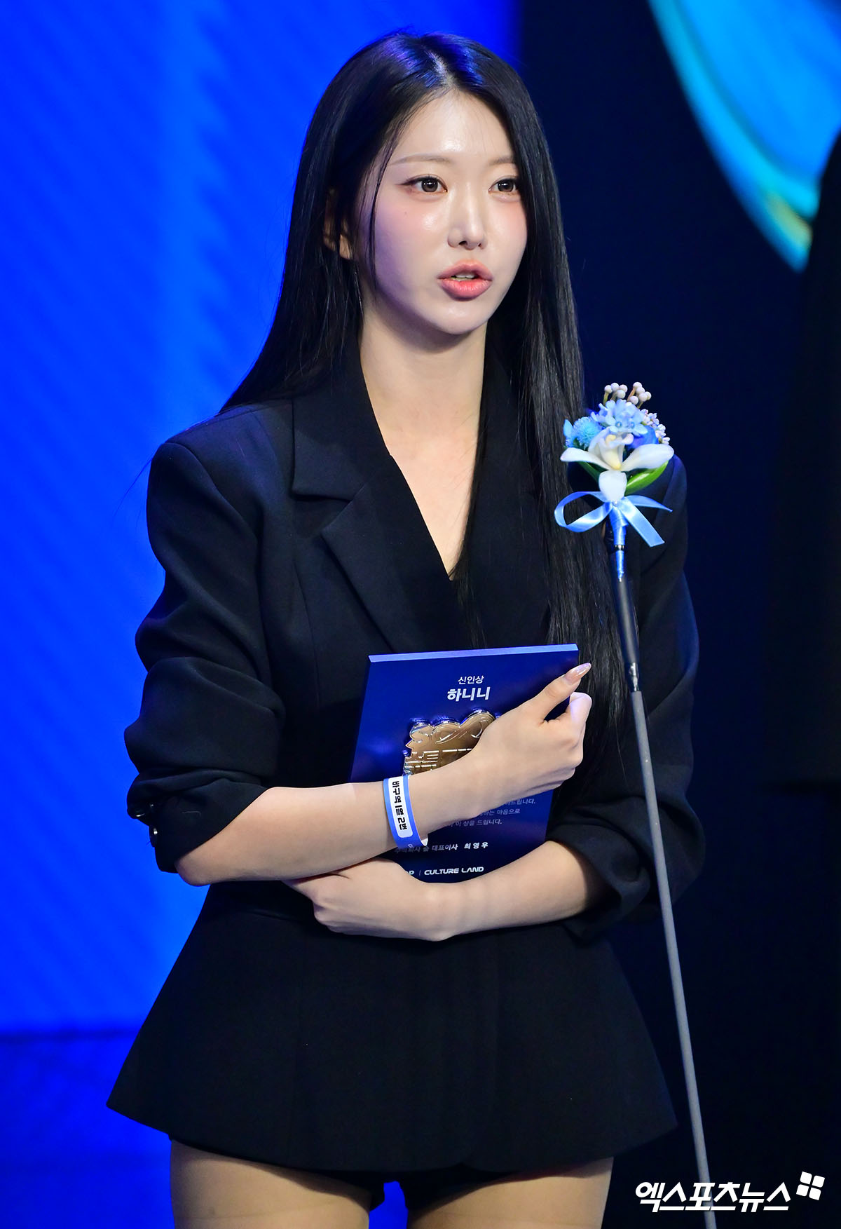 (엑스포츠뉴스 상암, 김한준 기자) 27일 오후 서울 상암 콜로세움에서 열린 '2025 SOOP 스트리머 대상' 시상식, 신인상을 수상한 하니니가 소감을 말하고 있다.