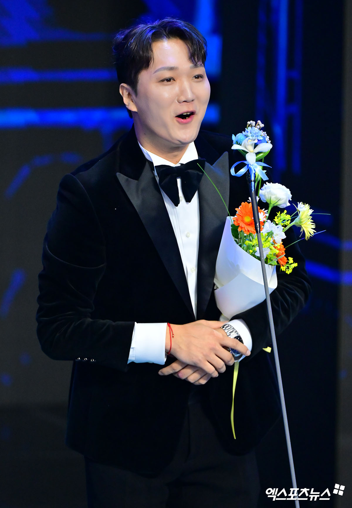 (엑스포츠뉴스 상암, 김한준 기자) 27일 오후 서울 상암 콜로세움에서 열린 '2025 SOOP 스트리머 대상' 시상식, 올해의 수상 스트리머를 수상한 홍타쿠가 소감을 말하고 있다.