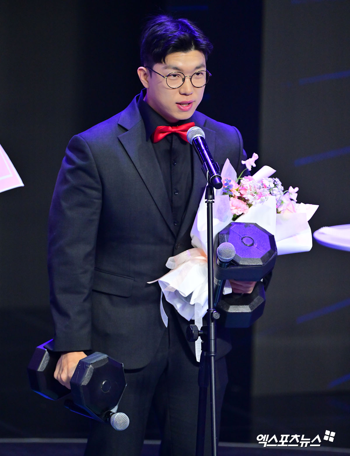 (엑스포츠뉴스 상암, 김한준 기자) 27일 오후 서울 상암 콜로세움에서 열린 '2025 SOOP 스트리머 대상' 시상식, 올해의 스트리머를 수상한 지피티가 소감을 말하고 있다.