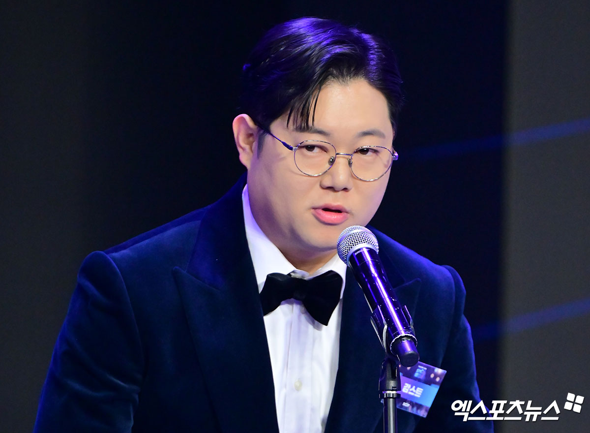 (엑스포츠뉴스 상암, 김한준 기자) 27일 오후 서울 상암 콜로세움에서 열린 '2025 SOOP 스트리머 대상' 시상식, 올해의 스트리머를 수상한 감스트가 소감을 말하고 있다.