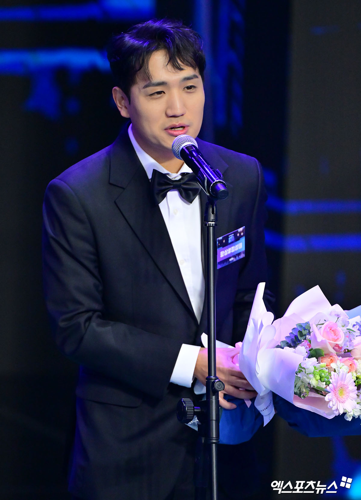 (엑스포츠뉴스 상암, 김한준 기자) 27일 오후 서울 상암 콜로세움에서 열린 '2025 SOOP 스트리머 대상' 시상식, 올해의 스트리머를 수상한 킴성태가 소감을 말하고 있다.