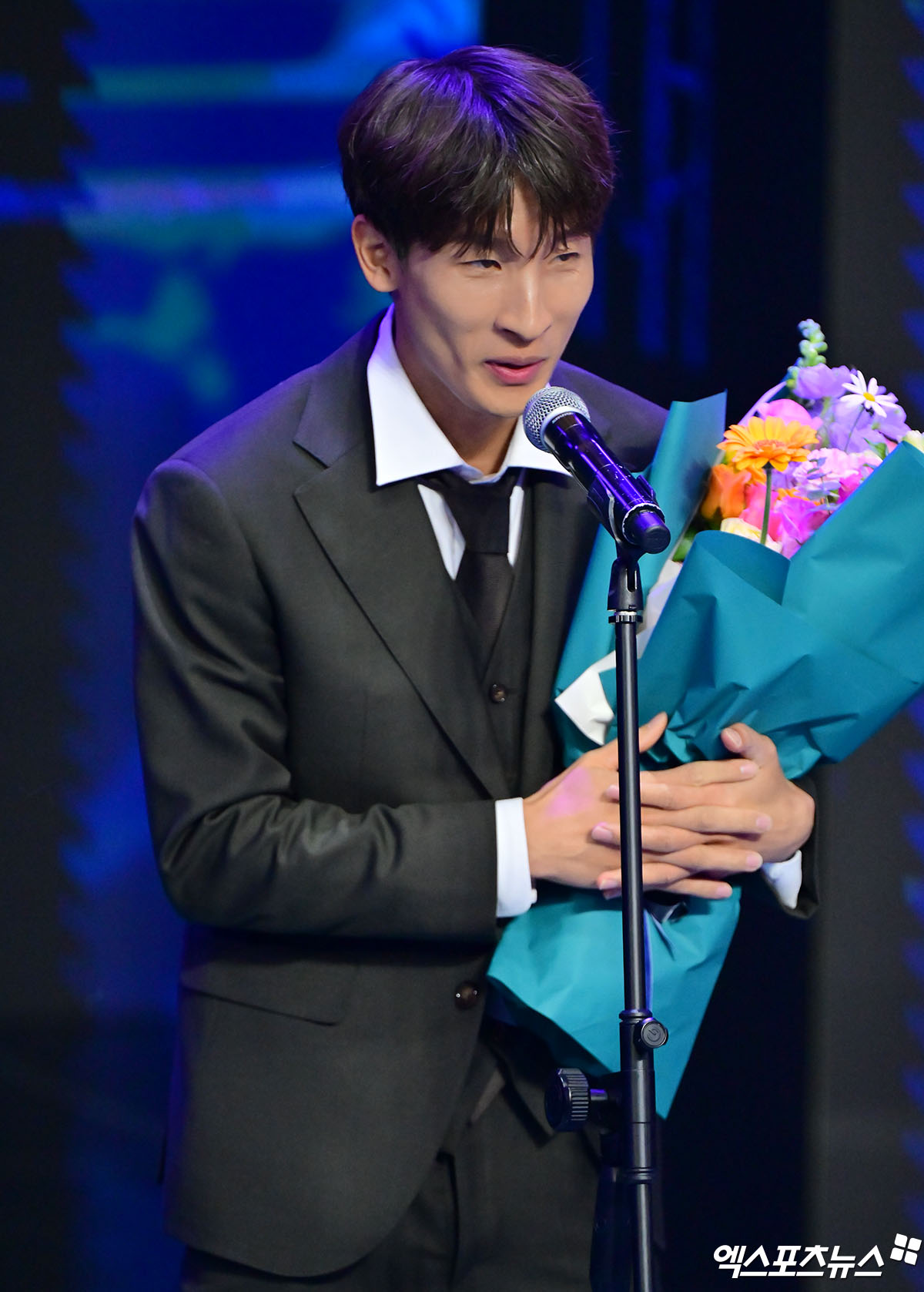 (엑스포츠뉴스 상암, 김한준 기자) 27일 오후 서울 상암 콜로세움에서 열린 '2025 SOOP 스트리머 대상' 시상식, 올해의 스트리머를 수상한 시조새가 소감을 말하고 있다.
