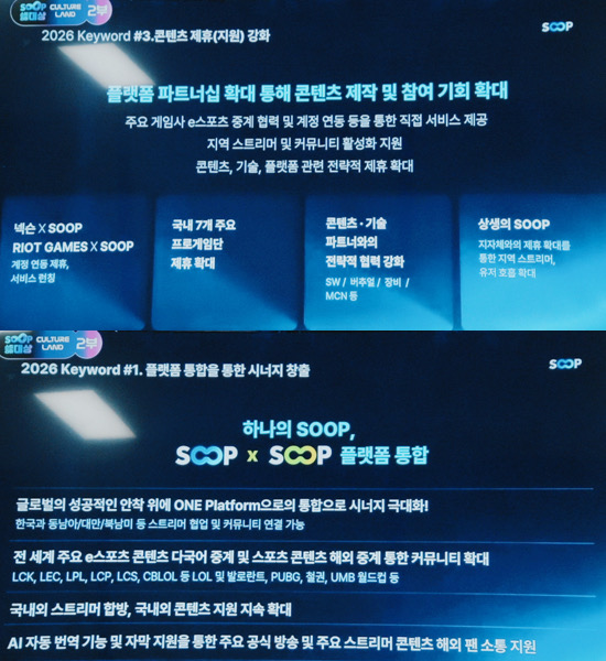 특히, 국내외 SOOP 플랫폼 통합 소식이 눈길을 끌었다. 현재는 국내, 글로벌 플랫폼이 별도로 운영되고 있으나 'ONE 플랫폼'으로 통합되는 것. 이를 통해 한국, 동남아, 대만, 북남미 등 스트리머들의 협업, 커뮤니티 강화 등을 도모한다.