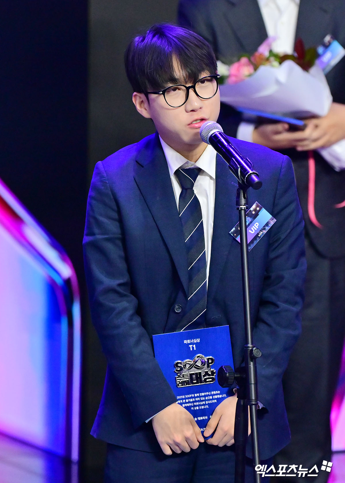 (엑스포츠뉴스 상암, 김한준 기자) 27일 오후 서울 상암 콜로세움에서 열린 '2025 SOOP 스트리머 대상' 시상식, 특별상을 수상한 T1 버즈가 소감을 말하고 있다.