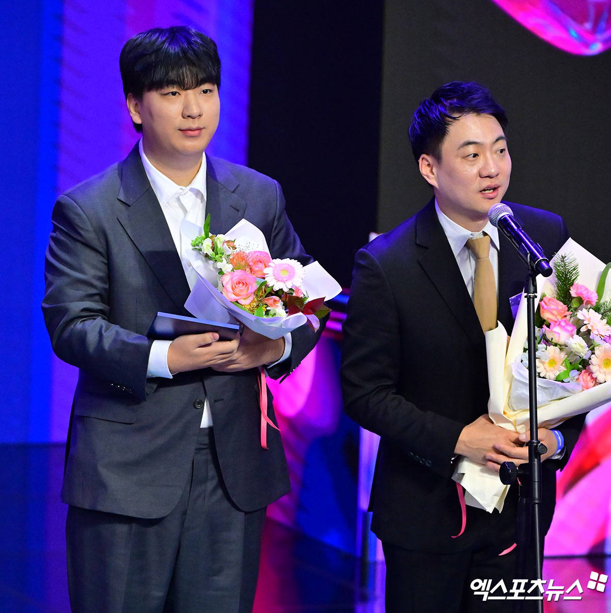 (엑스포츠뉴스 상암, 김한준 기자) 27일 오후 서울 상암 콜로세움에서 열린 '2025 SOOP 스트리머 대상' 시상식, 특별상을 수상한 젠지 텍스쳐와 이지훈 단장이 소감을 말하고 있다.