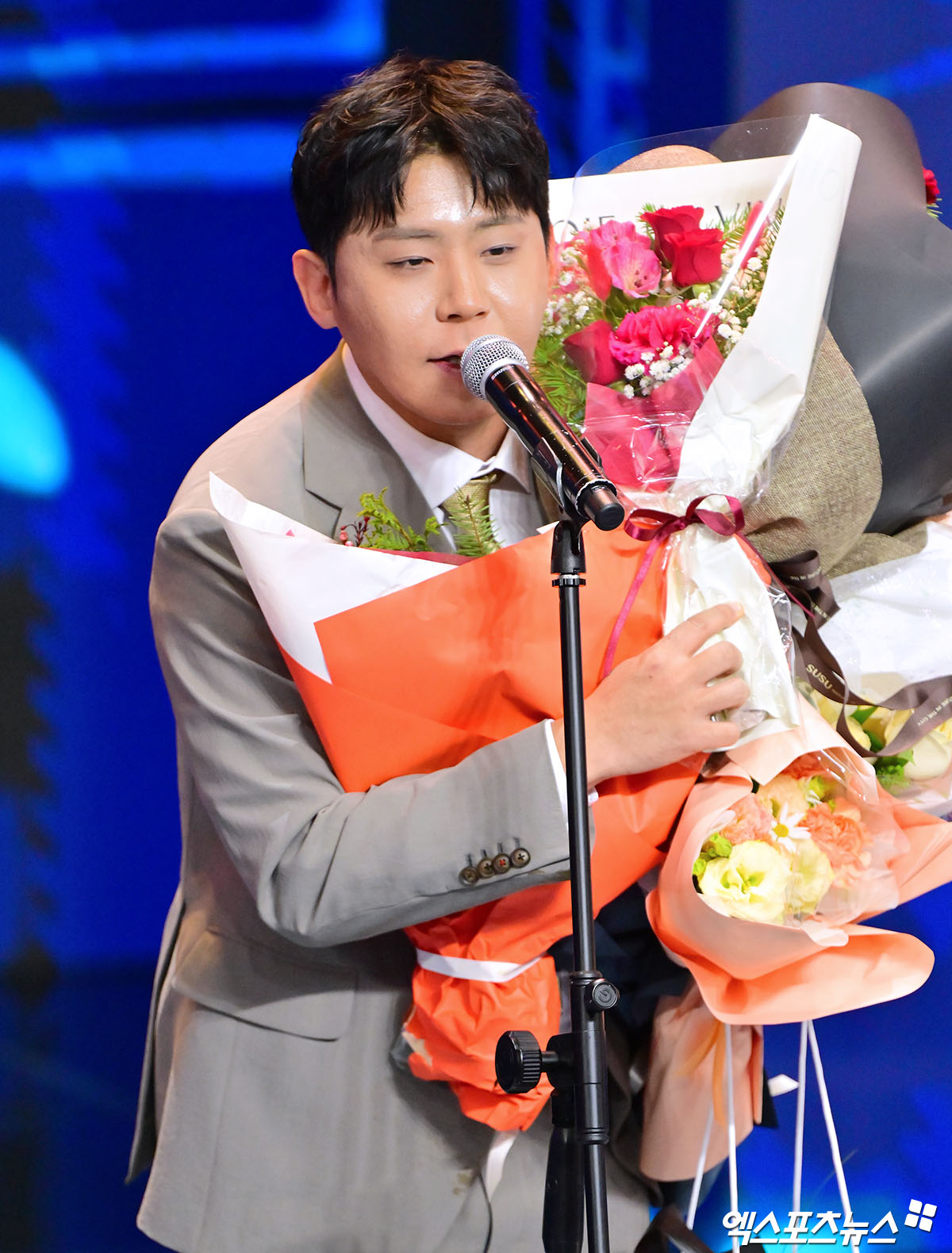(엑스포츠뉴스 상암, 김한준 기자) 27일 오후 서울 상암 콜로세움에서 열린 '2025 SOOP 스트리머 대상' 시상식, 올해의 스트리머를 수상한 철구형이 소감을 말하고 있다.