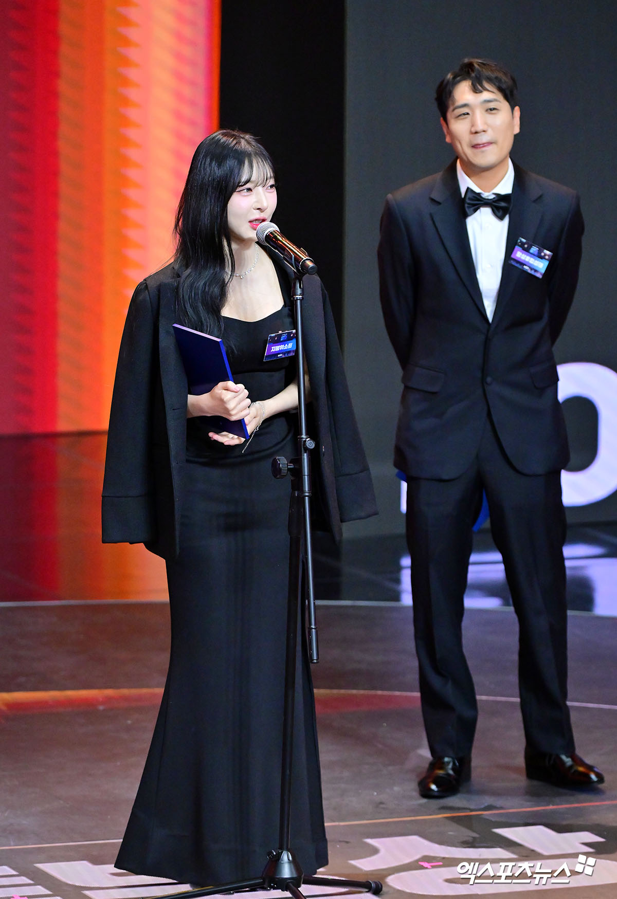 (엑스포츠뉴스 상암, 김한준 기자) 27일 오후 서울 상암 콜로세움에서 열린 '2025 SOOP 스트리머 대상' 시상식, 베스트 커플상을 수상한 킴성태-지붕위소희가 소감을 말하고 있다.