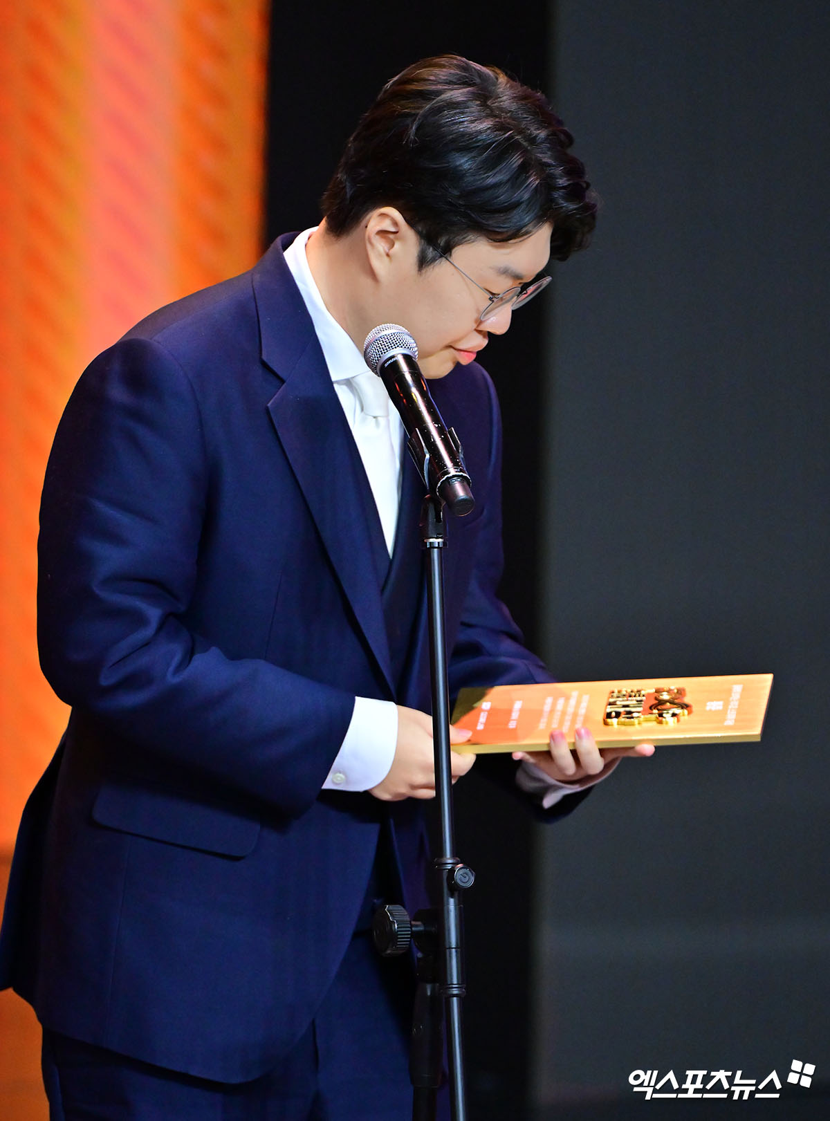 (엑스포츠뉴스 상암, 김한준 기자) 27일 오후 서울 상암 콜로세움에서 열린 '2025 SOOP 스트리머 대상' 시상식, 보이는라디오 스트리머 대상을 수상한 봉준이 소감을 말하고 있다.