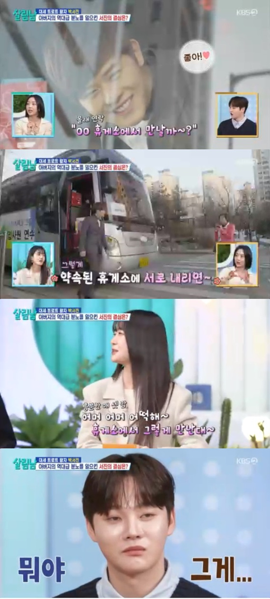 이요원은 휴게소에서의 짧은 만남에 대한 얘기를 듣고 설렘이 폭발한 모습을 보여줬다. 박서진은 이해가 안 된다는 표정이었다.