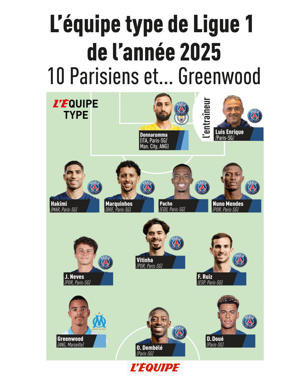 매체는 "올해 파리 생제르맹(PSG)은 유럽축구연맹(UEFA) 챔피언스리그 우승팀이다. 발롱도르 수상자도 있다. 리그1 올해의 팀을 구성하면서 2025년에 6관왕을 달성하고 구단의 국제적 영향력을 무시하기 어렵다"라며 PSG가 올해의 팀을 사실상 점령했다고 알렸다.