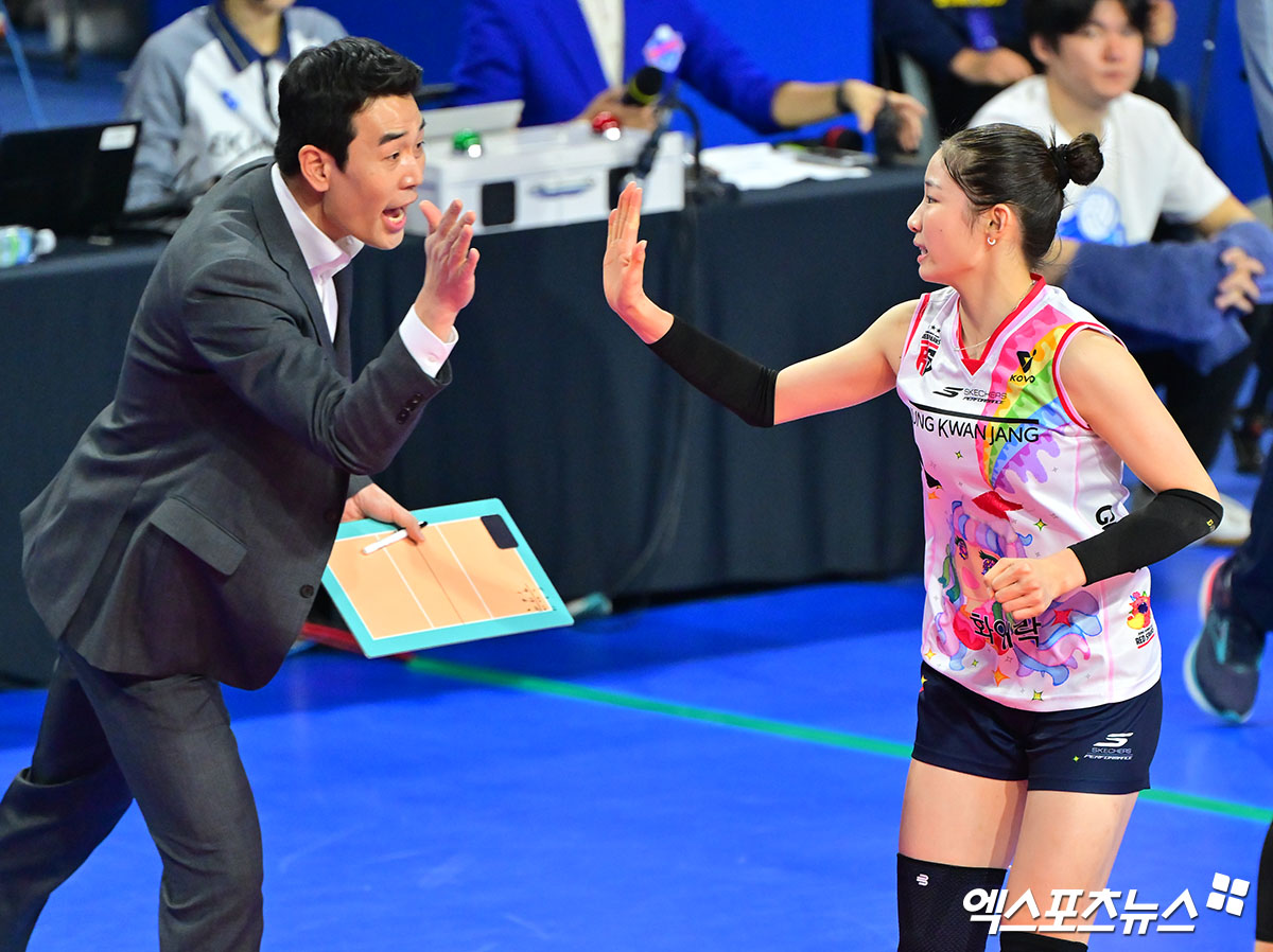 (엑스포츠뉴스 화성, 김한준 기자) 28일 오후 경기도 화성 종합실내체육관에 열린 '진에어 2025-2026 V-리그' IBK 기업은행과 정관장의 경기, 정관장 인쿠시가 득점 후 고희진 감독과 하이파이브를 하고 있다.