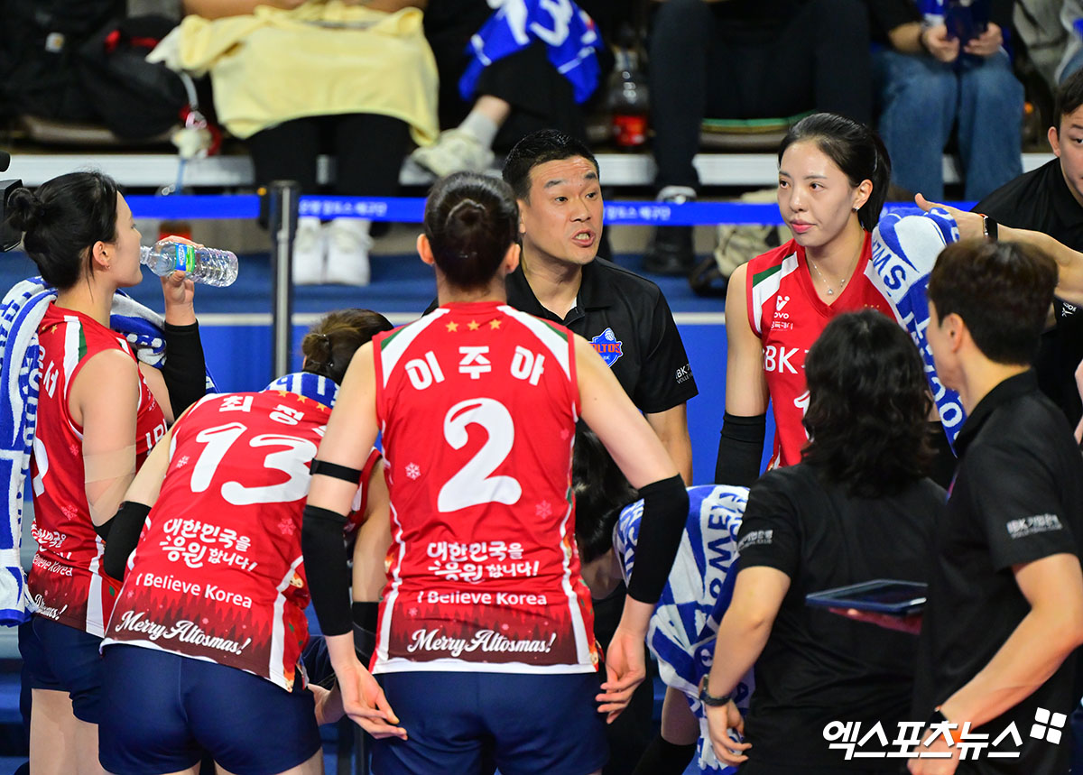 (엑스포츠뉴스 화성, 김한준 기자) 28일 오후 경기도 화성 종합실내체육관에 열린 '진에어 2025-2026 V-리그' IBK 기업은행과 정관장의 경기, 기업은행 여오현 감독대행이 작전타임을 갖고 있다.