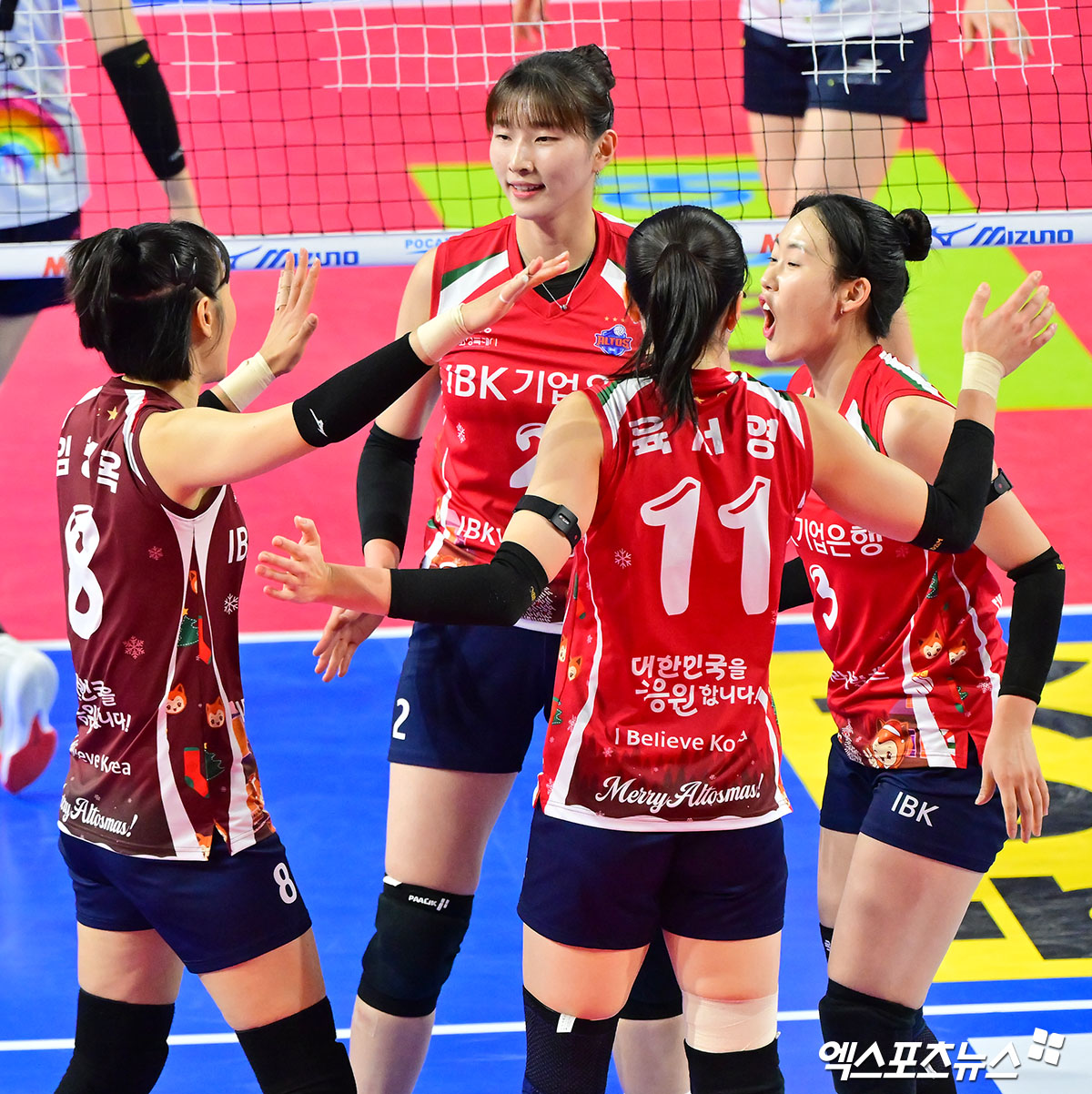 (엑스포츠뉴스 화성, 김한준 기자) 28일 오후 경기도 화성 종합실내체육관에 열린 '진에어 2025-2026 V-리그' IBK 기업은행과 정관장의 경기, 기업은행 이주아가 득점 후 기뻐하고 있다.