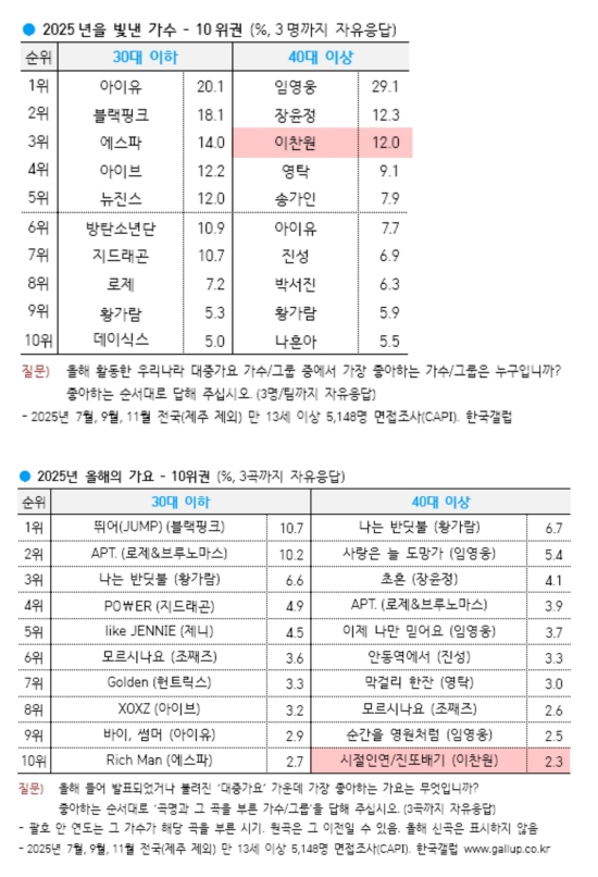 한국 갤럽은 최근 '2025 올해를 빛낸 가수'와 '2025년 올해의 가요'에 관한 리포트를 공개했다.