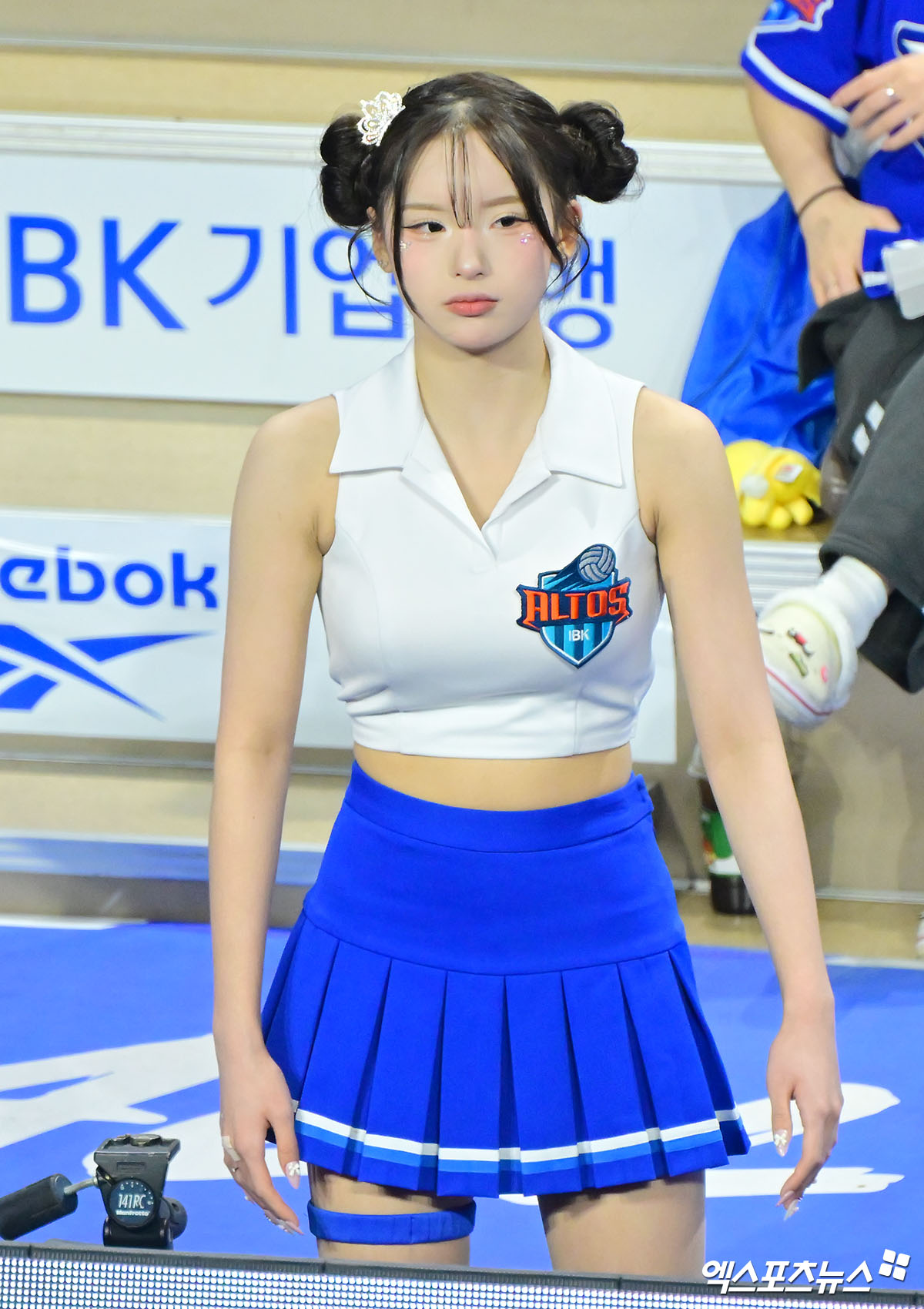 (엑스포츠뉴스 화성, 김한준 기자) 28일 오후 경기도 화성 종합실내체육관에 열린 '진에어 2025-2026 V-리그' IBK 기업은행과 정관장의 경기, 양효주 치어리더가 열띤 응원을 선보이고 있다.