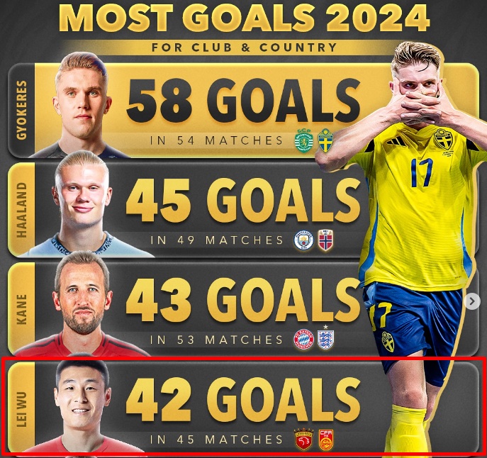 한편, 지난해엔 중국 공격수 우레이가 자국리그와 중국 대표팀에서 42골을 쏟아부어 2024년 전세계 득점 랭킹 4위에 오르는 일이 있었다. 이어 이번엔 우에다가 이름을 내밀게 됐다.