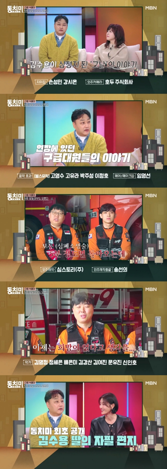 당시 김수용을 살린 119 구급대원들도 깜짝 등장했다. 구급대원들은 "신고 전화받고 8분 만에 현장에 도착했다"며 "보통은 5분 정도(에 회복이 된다). 이제는 희망이 없겠구나 생각을 했다"고 밝히며 매우 위급했던 상황이었음을 설명했다.