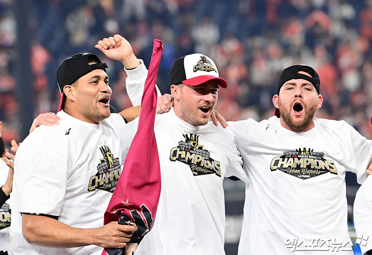 지난 10월 31일 오후 대전한화생명볼파크에서 열린 '2025 신한 SOL Bank KBO 한국시리즈' LG 트윈스와 한화 이글스의 경기, LG가 선발투수 톨허스트의 7이닝 1실점 완벽투에 힘입어 4:1의 스코어로 승리하며 시리즈 전적 4승1패로 통합우승을 이뤘다. 경기 종료 후 LG 치리노스, 톨허스트, 오스틴이 우승 세리머니를 하고 있다. 엑스포츠뉴스 DB