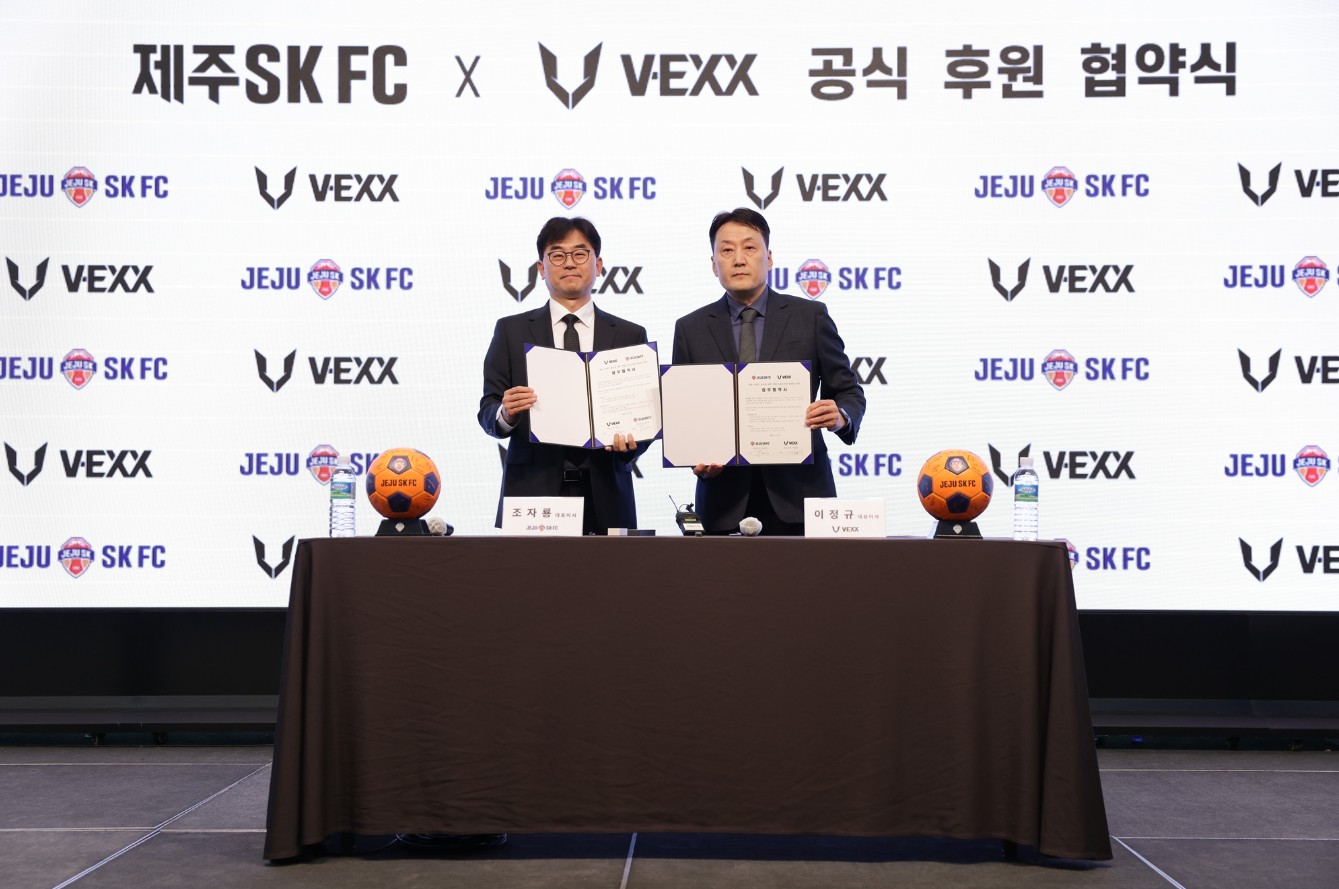 제주SK는 29일 V-EXX와 공식 용품 후원 계약을 체결했다고 밝혔다. 이번 계약은 기본 3년에 1년 연장 옵션이 포함된 '3+1년' 장기 계약으로, V-EXX는 2026시즌부터 제주SK 선수단과 코칭스태프를 비롯해 유소년팀까지 경기·훈련용 의류 및 각종 용품을 독점 공급한다.