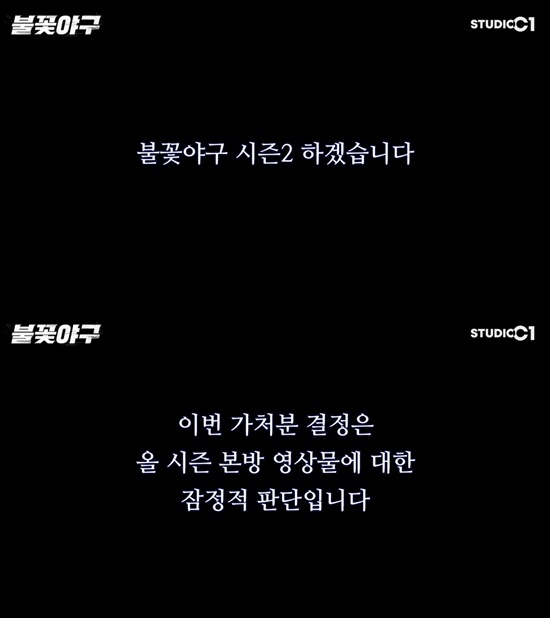 영상 말미에 스튜디오C1 측은 “이번 가처분 결정은 올 시즌 본방 영상물에 대한 잠정적 판단입니다”라며 “불꽃야구 시즌2 하겠습니다”라고 밝혔다.