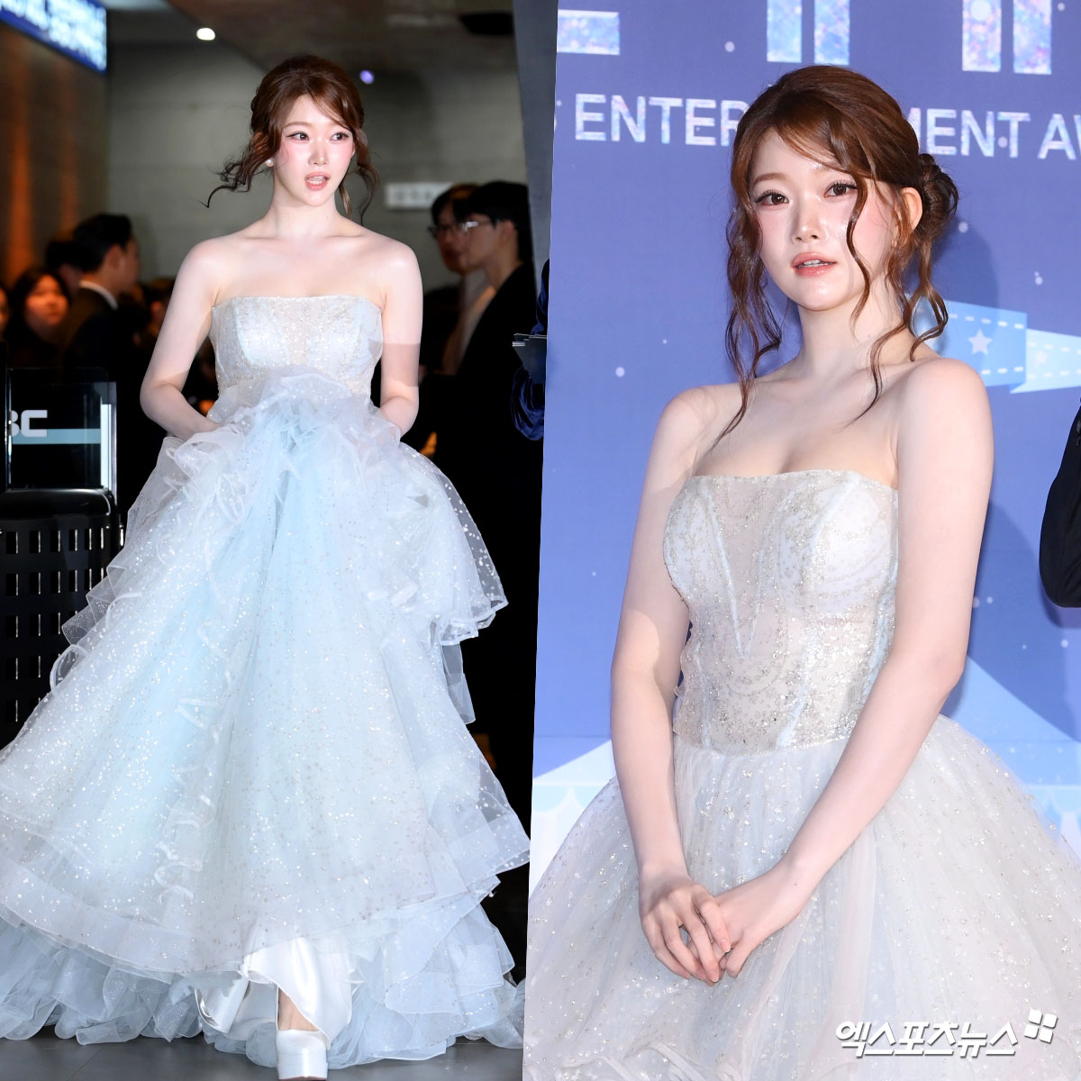 츠키는 은은한 블루빛의 튜브톱 드레스를 선택해 그동안 쉽게 볼 수 없었던 글래머러스한 실루엣을 강조했다. 어깨와 쇄골 라인을 과감하게 드러낸 디자인에 풍성한 볼륨감의 스커트가 더해져 동화 속 공주님 같은 분위기를 완성했으며, 자연스럽게 묶은 헤어와 은은한 윤광 메이크업으로 청순함과 성숙미를 동시에 잡았다. 예능에서 보여준 털털한 이미지와는 또 다른, ‘본 적 없는 글래머 몸매’가 강렬한 대비를 이루며 존재감을 각인시켰다.