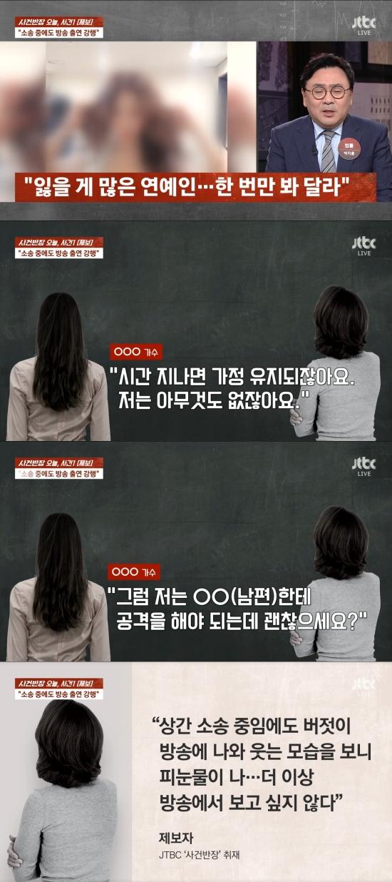 '사건반장' 측은 "여가수는 이 돈을 혼자서 감당할 수 없으니 남편을 공격해야 하는데 감당할 수 있겠냐는 말이다. 통화 후에는 제보자에게 '어머니가 암이라고 한다. 수술비 치료비 걱정을 하고 있다. 병원비 벌어야 하니까 선처를 부탁드린다'고 했다. 제보자는 '(가정을) 파탄 내놓고 돈을 이유로 사정을 봐달라고 하니까 괘씸하고 기가 막히다'고 한다. 또 '유튜브 등에 여성의 행사장에 남편이 동행하는 모습이 올라오고 결혼식장에서 축가를 부를 때마다 괘씸했다. 더 이상 방송에 나오는 모습을 보고 싶지 않아 제보를 결심하게 됐다'고 전해왔다"고 밝혔다.