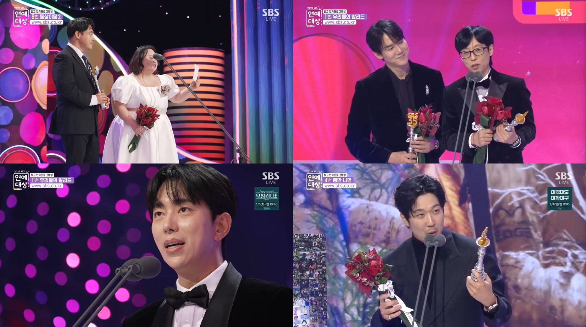 우수상은 '틈만 나면,'의 유연석과 '런닝맨' 지예은, '미운 우리 새끼' 윤시윤, '골 때리는 그녀들' 박하얀이 수상했다. 지예은은 울컥해 말을 잇지 못하는 모습으로 '런닝맨' 멤버들을 폭소케 했다. AI가 뽑은 SBS의 얼굴이라는 독특한 상은 올해 SBS에 981분 이상 출연한 유재석이 가져갔다.