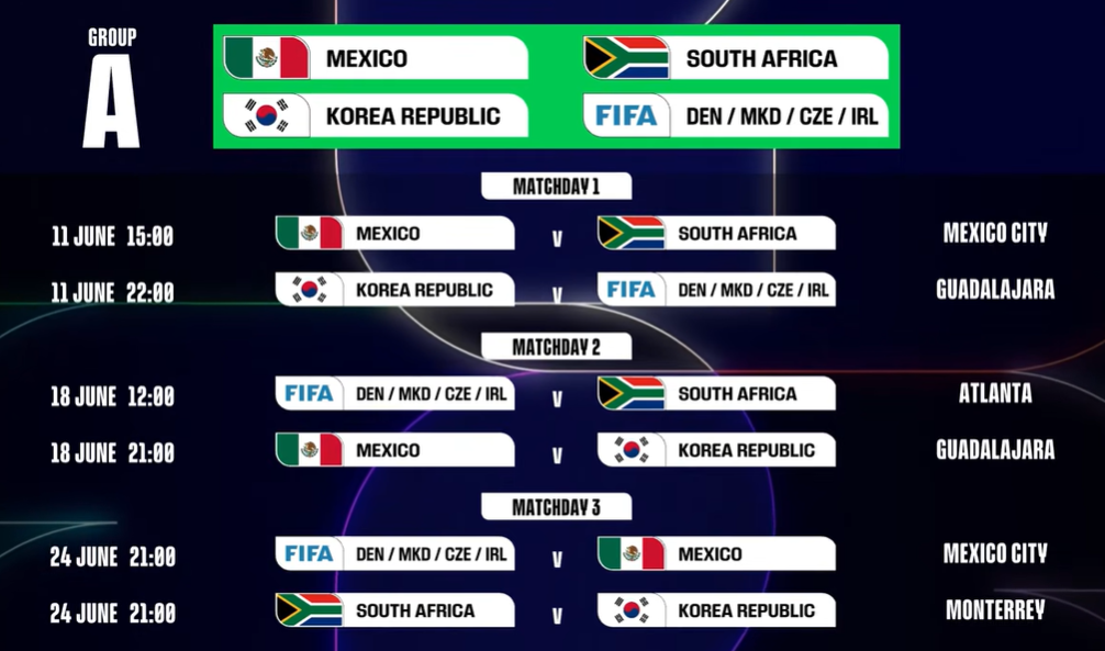 한국은 조별리그에서 개최국 중 하나인 멕시코가 있는 A조에 편성됐다. 멕시코, 한국 외에도 남아프리카공화국과 유럽 예선 플레이오프D 승자(덴마크, 북마케도니아, 아일랜드, 체코 중 하나)가 A조에 이름을 올렸다.