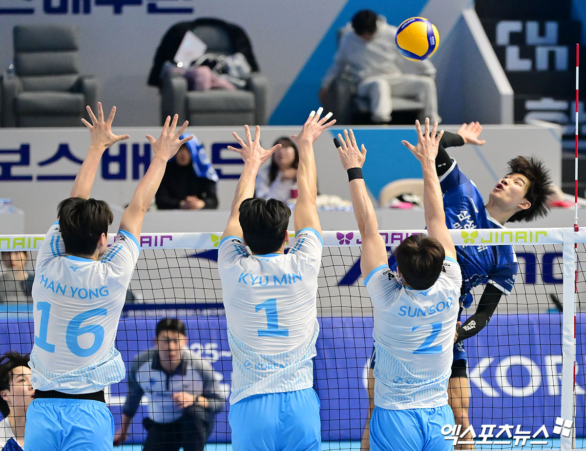 (엑스포츠뉴스 인천, 김한준 기자) 1일 오후 인천 계양체육관에서 열린 '진에어 2025-2026 V-리그' 대한항공과 삼성화재의 경기, 삼성화재 이윤수가 공격을 시도하고 있다.