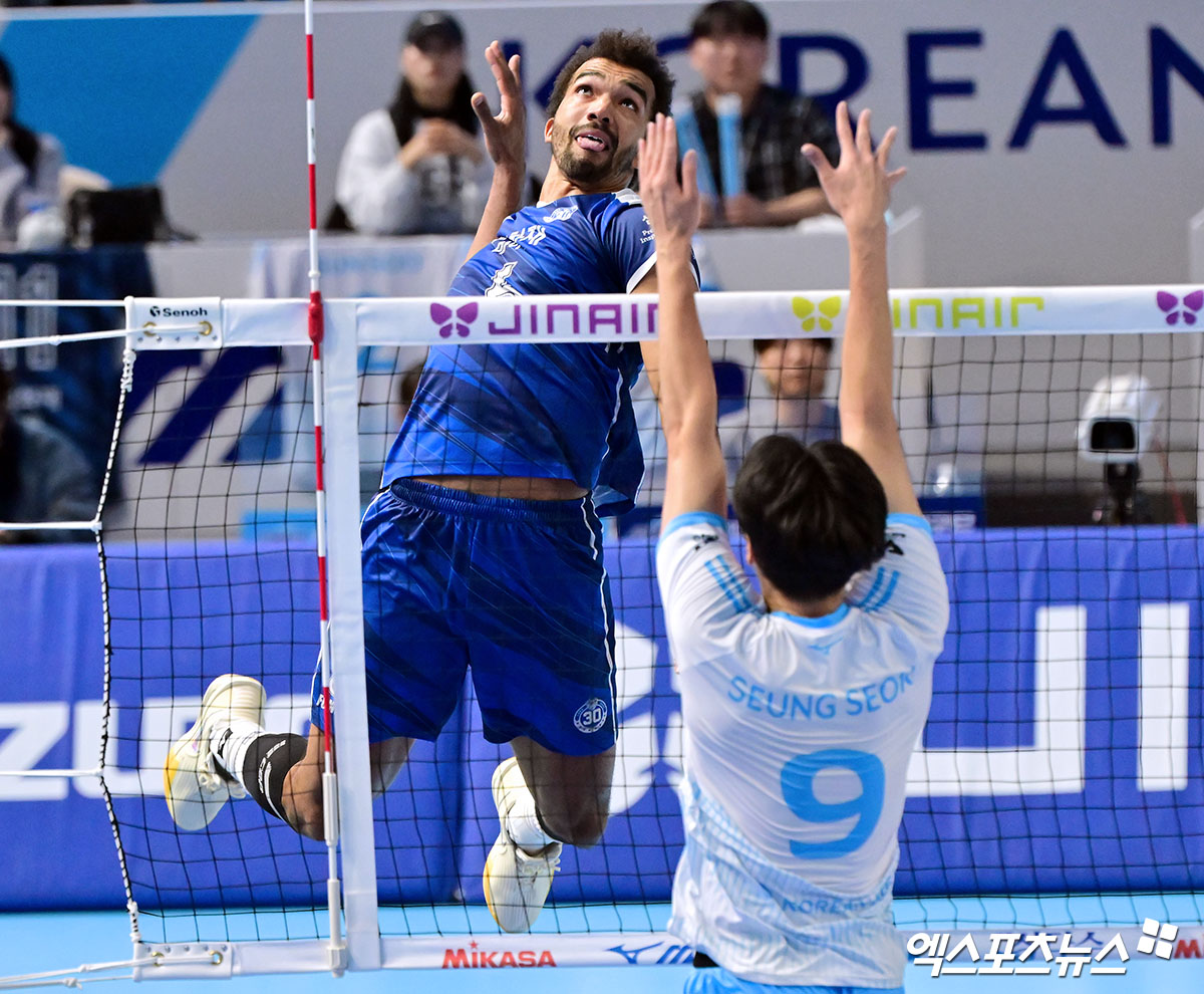 (엑스포츠뉴스 인천, 김한준 기자) 1일 오후 인천 계양체육관에서 열린 '진에어 2025-2026 V-리그' 대한항공과 삼성화재의 경기, 삼성화재 아히가 공격을 시도하고 있다.