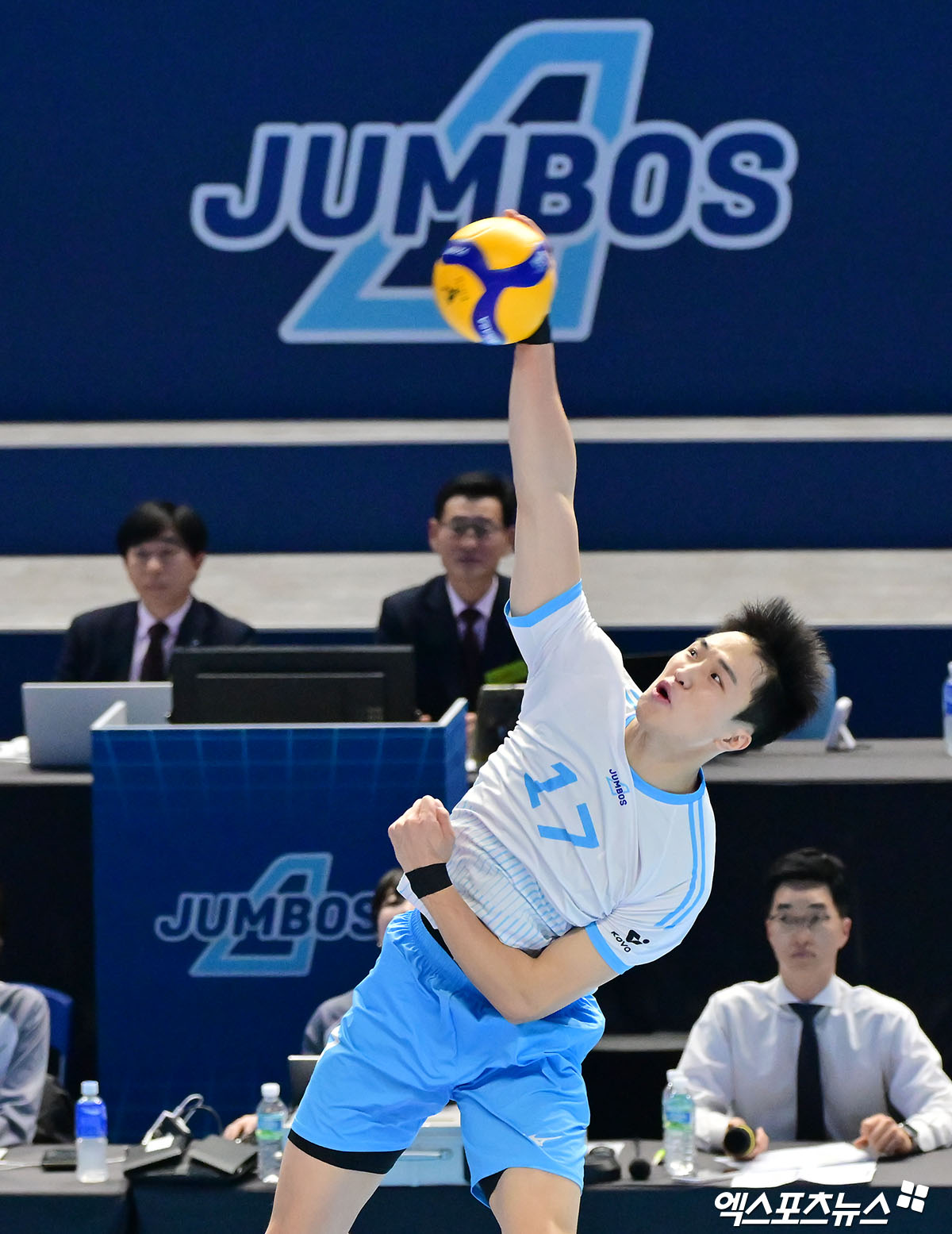 (엑스포츠뉴스 인천, 김한준 기자) 1일 오후 인천 계양체육관에서 열린 '진에어 2025-2026 V-리그' 대한항공과 삼성화재의 경기, 대한항공 임동혁이 공격을 시도하고 있다.