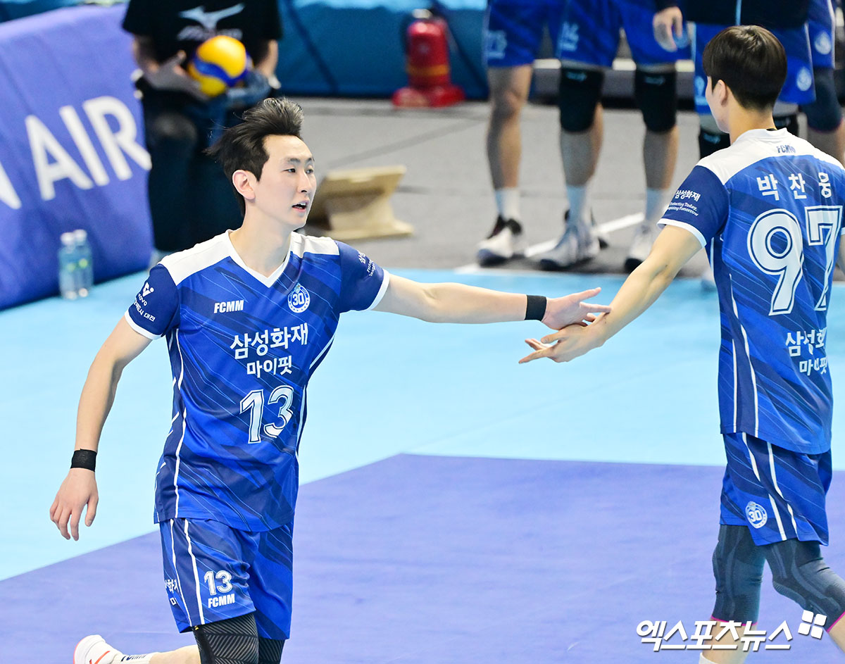 (엑스포츠뉴스 인천, 김한준 기자) 1일 오후 인천 계양체육관에서 열린 '진에어 2025-2026 V-리그' 대한항공과 삼성화재의 경기, 삼성화재 김준우가 득점 후 기뻐하고 있다.