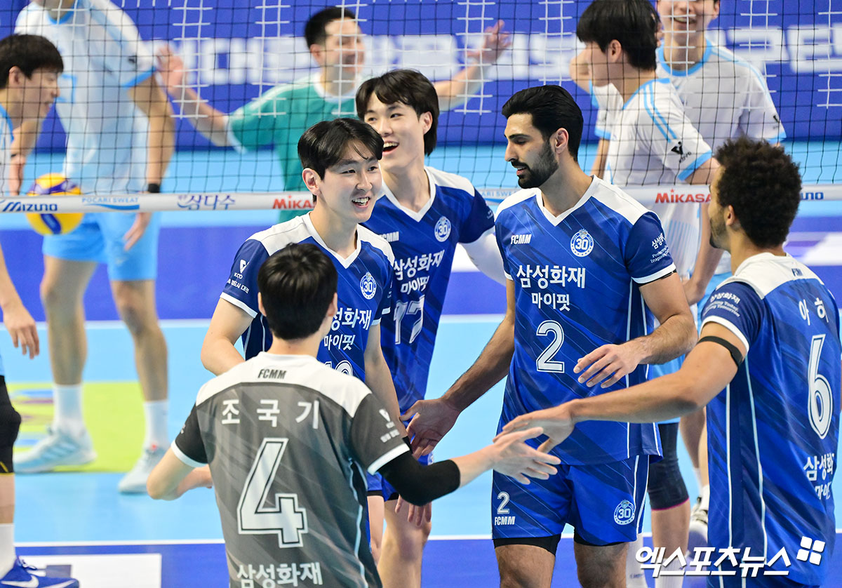(엑스포츠뉴스 인천, 김한준 기자) 1일 오후 인천 계양체육관에서 열린 '진에어 2025-2026 V-리그' 대한항공과 삼성화재의 경기, 삼성화재 선수들이 득점 후 기뻐하고 있다.