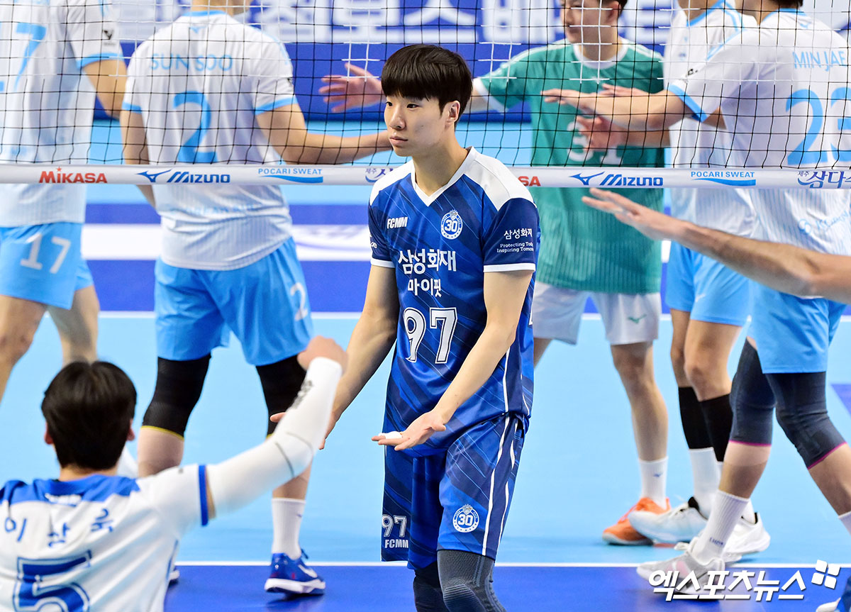 (엑스포츠뉴스 인천, 김한준 기자) 1일 오후 인천 계양체육관에서 열린 '진에어 2025-2026 V-리그' 대한항공과 삼성화재의 경기, 삼성화재 박찬웅이 블로킹 성공 후 기뻐하고 있다.