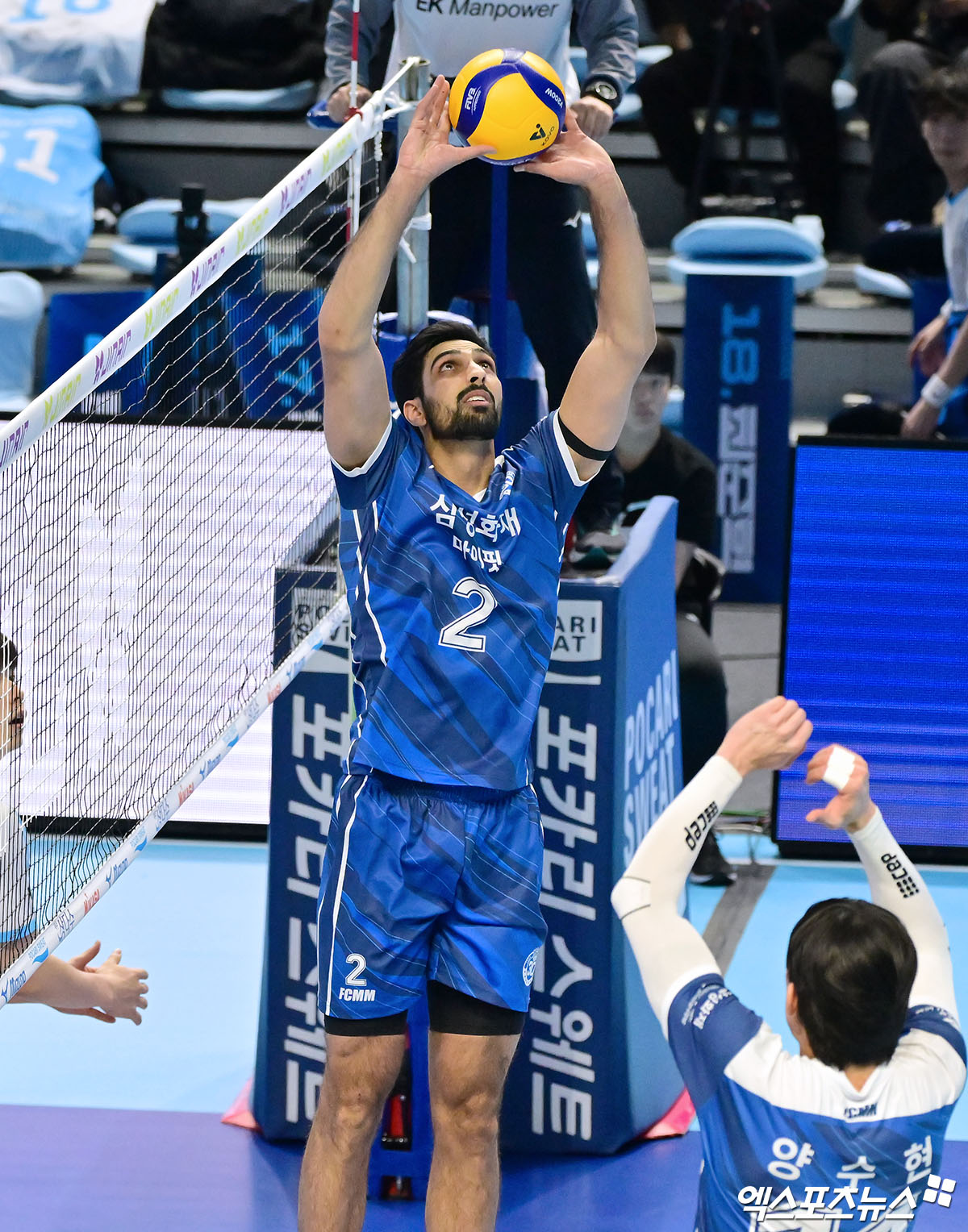 (엑스포츠뉴스 인천, 김한준 기자) 1일 오후 인천 계양체육관에서 열린 '진에어 2025-2026 V-리그' 대한항공과 삼성화재의 경기, 삼성화재 도산지가 토스를 하고 있다.