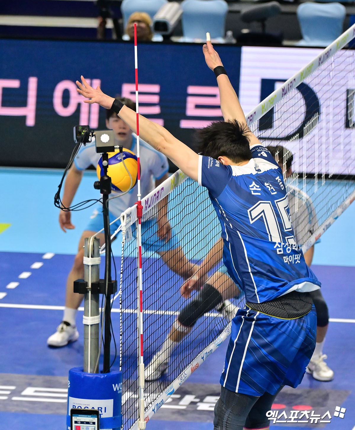 5세트 삼성화재 손현종이 블로킹에 성공하고 있다.