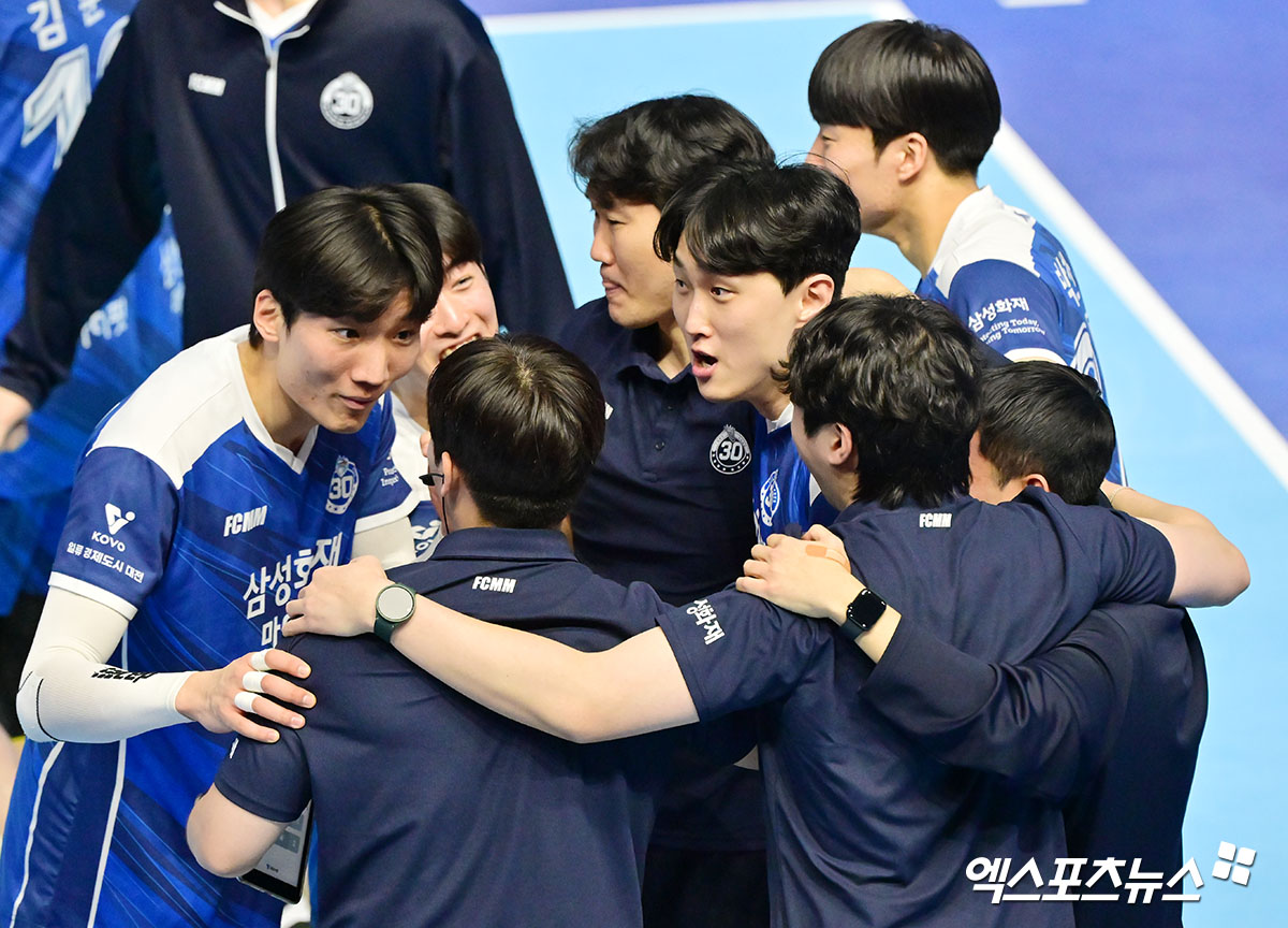 이날 경기에서 승리한 삼성화재 선수들이 기뻐하고 있다.