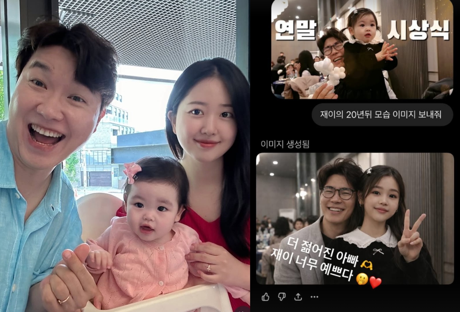 또 김다예는 지난달 27일 업로드한 유튜브 채널 썸네일을 보내며 "재이의 20년 뒤 모습 이미지 보내줘"라고 요구했고, AI로 만든 이미지를 본 김다예는 "더 젊어진 아빠, 재이 너무 예쁘다"라고 감탄했다.