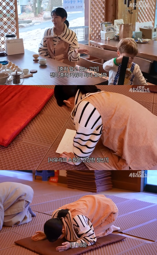 이어 사유리는 108배를 하기 위해 법당으로 향했다. 108배를 올리기 전,  그는 소원으로 '건강한 정신과 구독자 60만 명'을 적었다.
