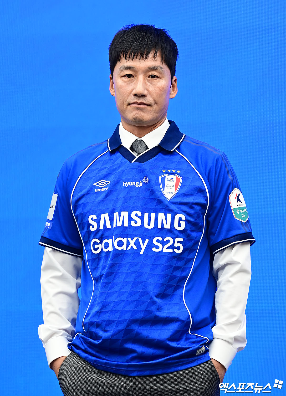 (엑스포츠뉴스 수원, 박지영 기자) 2일 오후 수원 도이치월드 차란차 스튜디오에서 열린 수원삼성 제11대 신임 감독 취임 기자회견에 참석한 이정효 감독이 기념 촬영을 하고 있다.