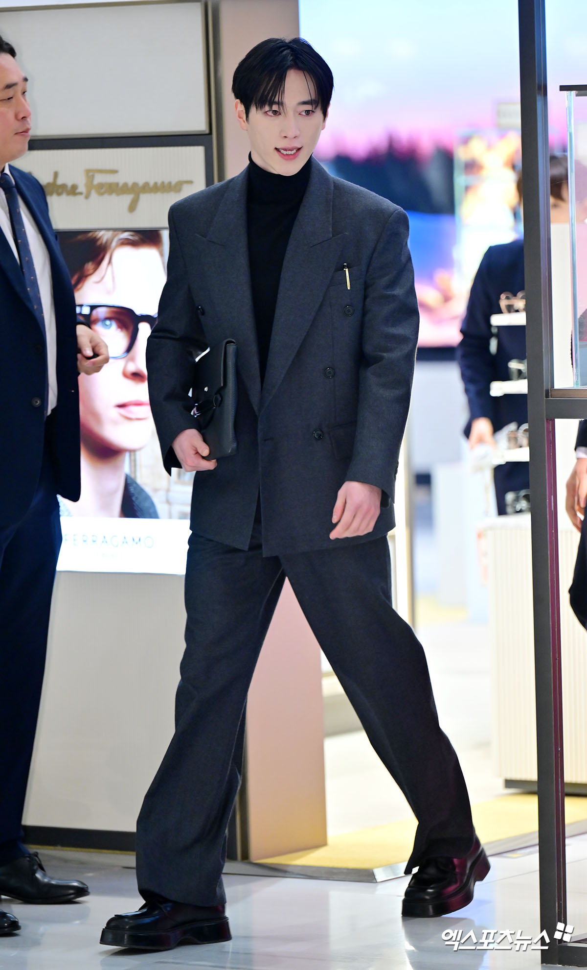 이날 착용한 스타일링은 그레이 톤 더블브레스트 슈트에 블랙 터틀넥을 매치한 클래식한 조합이 돋보였다. 전체적인 실루엣은 여유 있게 떨어지는 핏으로 구성돼 편안함과 격식을 동시에 갖췄으며, 울 소재 특유의 질감이 은은한 고급스러움을 배가시켰다.