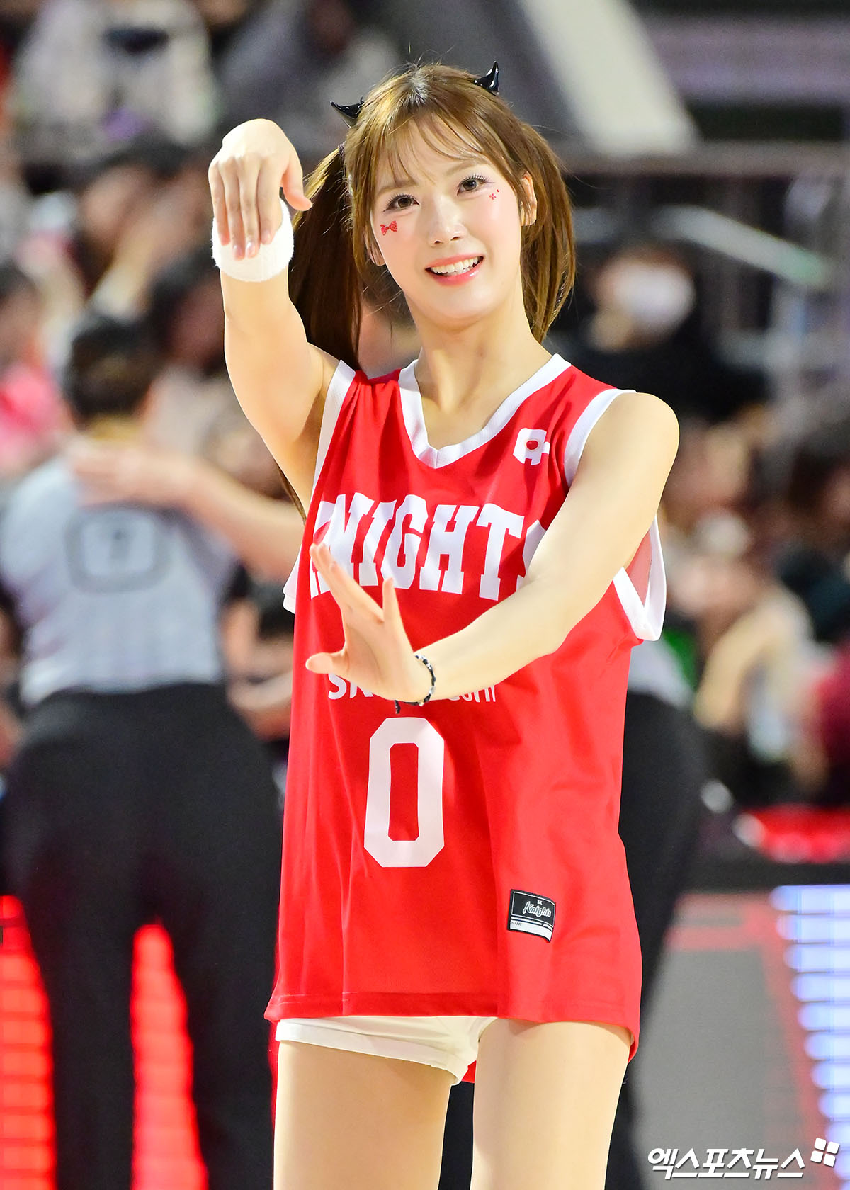 (엑스포츠뉴스 잠실학생체, 김한준 기자) 3일 오후 서울 송파구 잠실학생체육관에서 열린 2025-2026 LG전자 프로농구 서울 SK와 안양 정관장의 경기, 아야카 치어리더가 열띤 응원을 선보이고 있다.