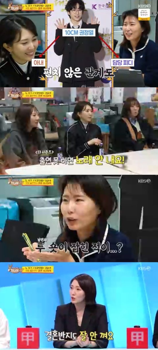 김윤주는 최지나PD가 남편이자 현재 '더 시즌즈' MC인 권정열과 투숏이 잡힌 적이 있는지 물어보자 없다고 말했다.