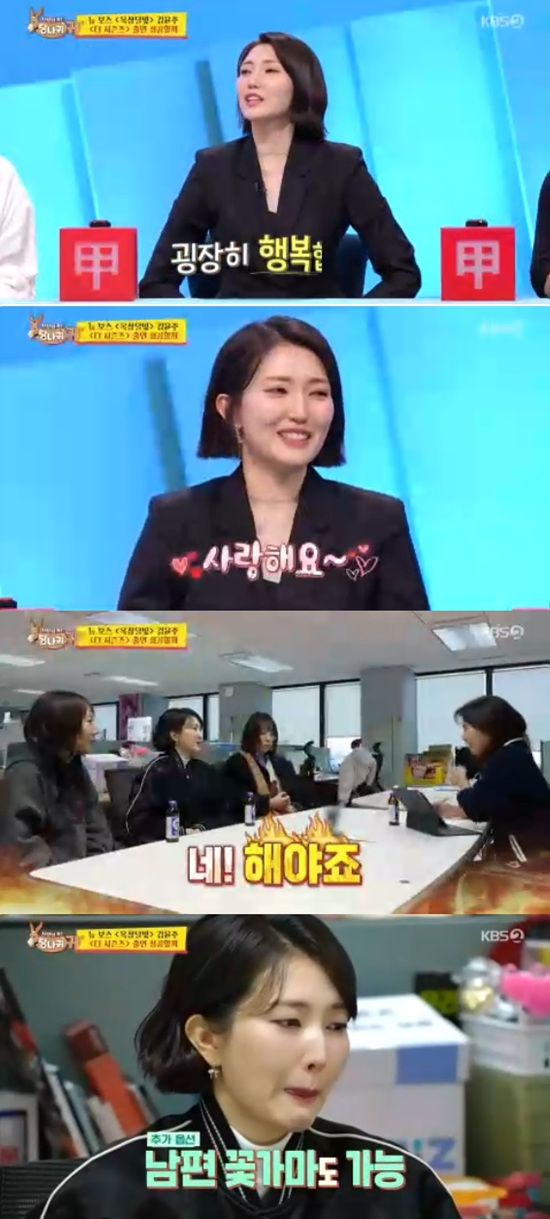 김윤주는 스튜디오에서 "결혼 반지도 아무도 껴본적 없다"면서 전현무가 "결혼한 게 맞는 거냐"고 의심하자 "행복하다. 사랑해요"라고 말했다.