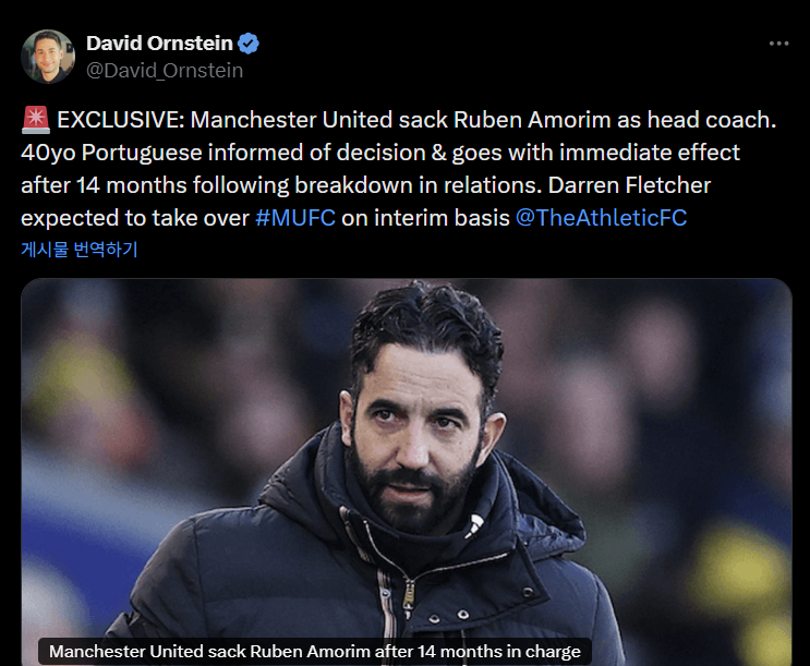 글로벌 스포츠 미디어 '디 애슬레틱'의 저명기자 데이비드 온스테인은 5일(한국시간) 오후 6시57분 "맨체스터 유나이티드, 후벵 아모림 감독 경질됐다. 40세 포르투갈 출신 감독은 14개월 재임 기간 중의 관계 악화로 인해 즉시 사임하게 됐다. 대런 플레처가 임시 감독으로 부임할 것으로 예상된다"고 자신의 SNS를 통해 알렸다.