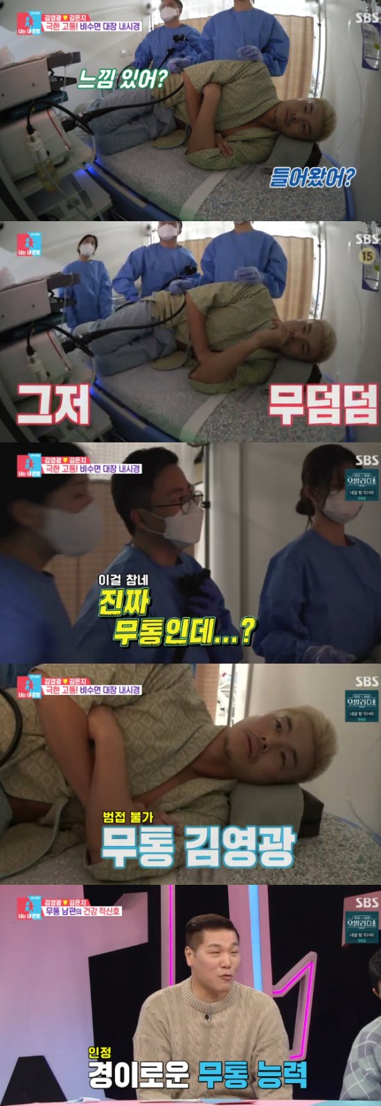 내시경을 진행하던 의료진도 "진짜 잘 받는다. 이걸 어떻게 참느냐"면서 '무통맨' 김영광을 인정했다. 이 모습을 지켜보던 서장훈 역시도 "우리나라에서 저렇게 내시경을 받을 수 있는 사람이 몇 명이나 있겠냐"고 놀라기도.