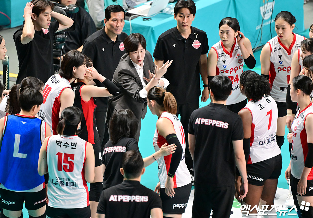 (엑스포츠뉴스 장충, 김한준 기자) 6일 오후 서울 장충체육관에서 열린 '진에어 2025-2026 V-리그' GS칼텍스와 페퍼저축은행의 경기, 페퍼저축은행 장소연 감독이 작전을 지시하고 있다.